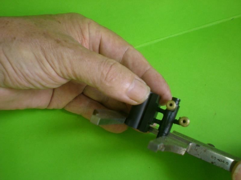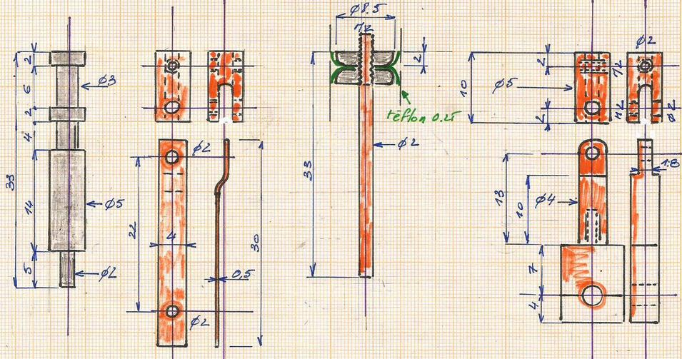| Sur le support arrière, pour le pivotement du balancier, un ressort permettra de le régler en position stable grâce au levier. Les têtes des vis qui servent de pivots ont été reprises au tour pour ne laisser qu'un rond de 0.5 d'épaisseur. Ces pivots seront soudés à l'étain.