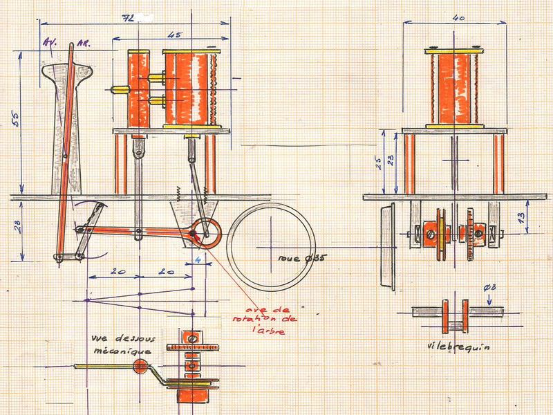 Sur la droite, le plan de la bielle et une idée pour éviter d'avoir une bielle coudée qui est généralement source d'ennuis. Il suffirait de prévoir le montage du groupe moteur de biais et notre tiroir viendrait à l'aplomb d'une bielle droite ... |