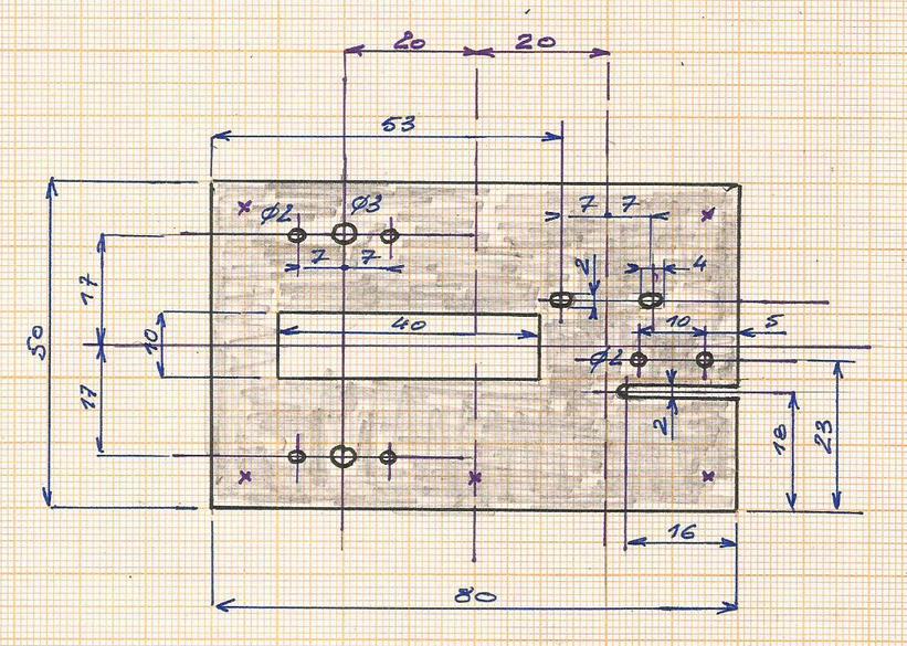 Il est plus facile de réaliser une patte de fixation que deux ... Plat de 2 d'épaisseur percé au centre de trous de 2.5 et dans les coins de trous de 1.6.