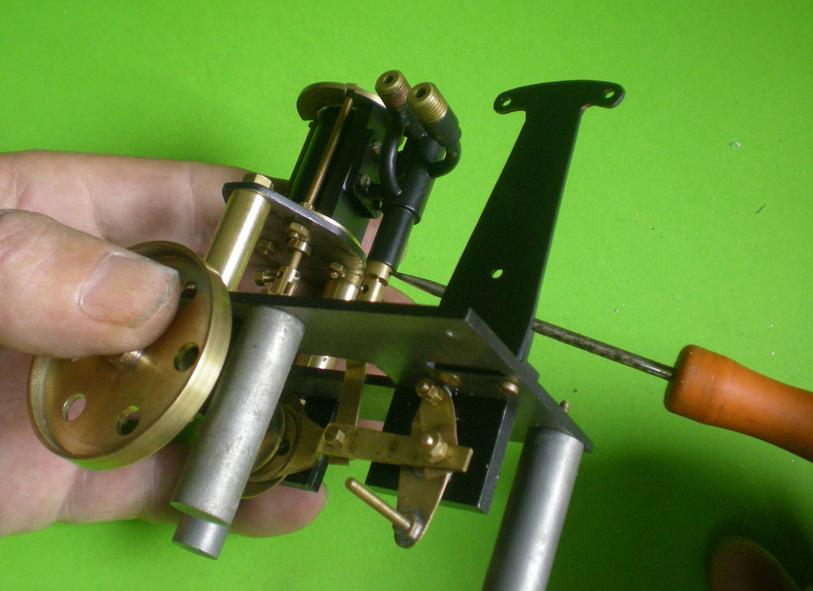 Réglage de la position du tiroir : lorsque le piston est au PMH, notre tiroir doit être en position médiane. On verra que ce réglage est beaucoup moins pointu que pour d'autres moteurs car notre levier va positionner le tiroir suivant la position qu'on lui donnera. |