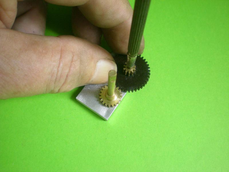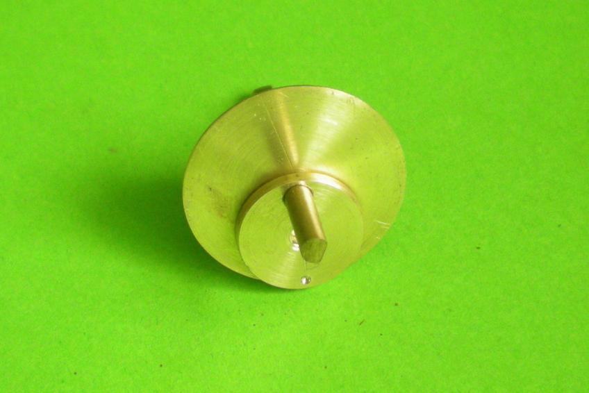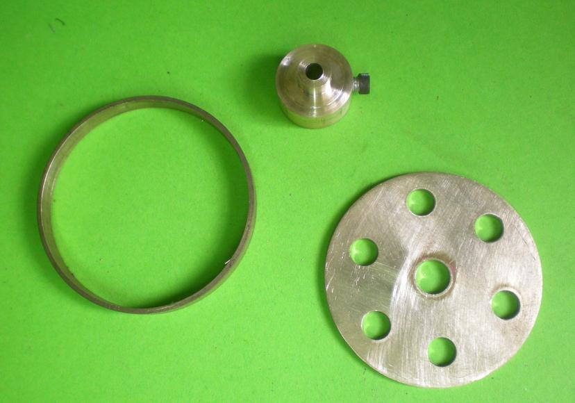 Le volant tout simple : une bague de 38 x40 et de 5 de large, un disque de 1.5 d'épaisseur et 38 de diamètre, un moyeu tiré d'un rond de 16. |