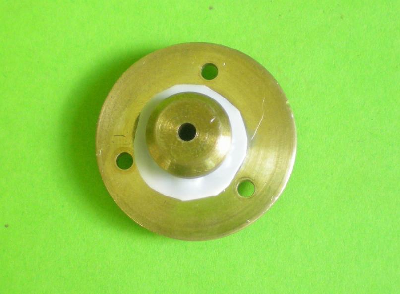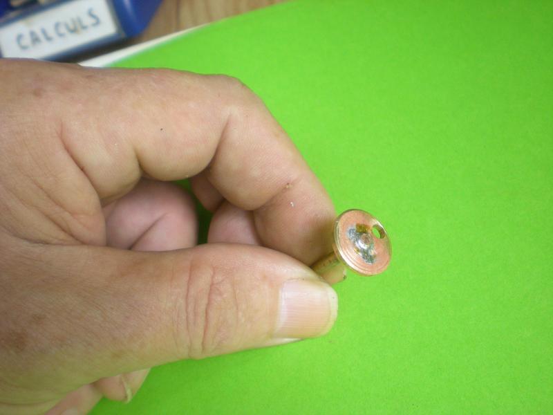 | Après soudure. Sur des photos qui vont suivre, on verra apparaître, juste au-dessous du repère, un autre trou de 3 : plutôt que de refaire un autre disque pour un excentrique de 4, j'ai dessoudé celui-ci et ai percé de l'autre côté (facile grâce au repérage). |