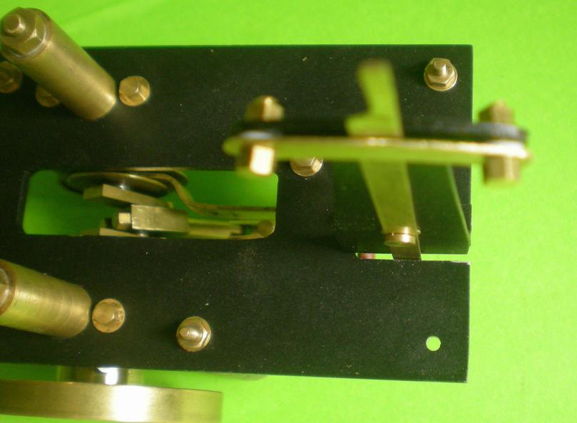 | Equiper le troisième support du balancier, le positionner (vis non serrées), enfiler la bielle de l'excentrique, visser après avoir positionné de manière à ce que le balancier soit vertical. On remarque une tête de vis réduite en épaisseur et entrant dans un lamage de la platine : sans cela, on touchera le balancier. |