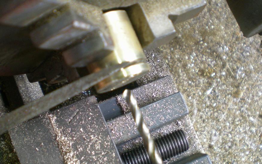 Une fois cette opération terminée, on dévisse le mandrin, on le place sur le tour et on perce à 5. |