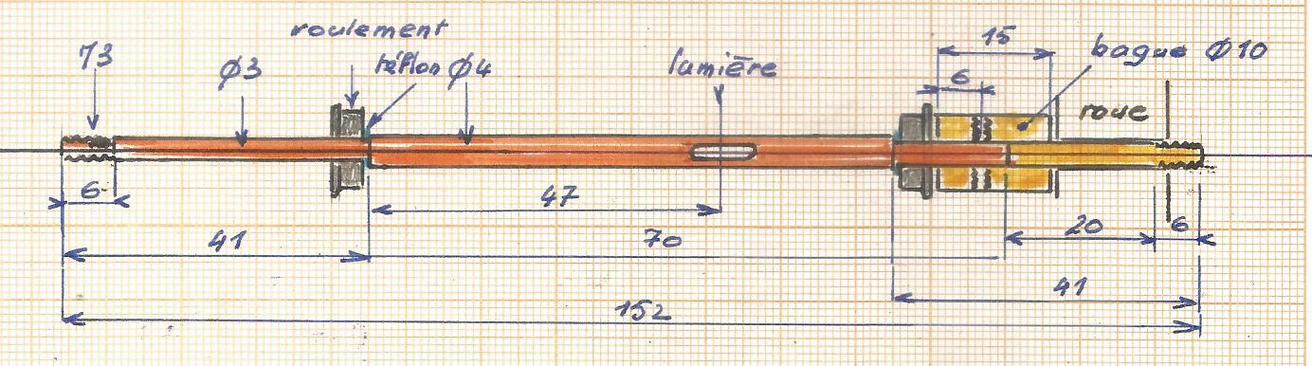 en rond de 4. Quand, comme moi, on a des difficultés pour obtenir une bonne cote de 3 sur une longueur de 41, il es possible de prévoir (droite sur le croquis) une bague pour le montage des roues. |