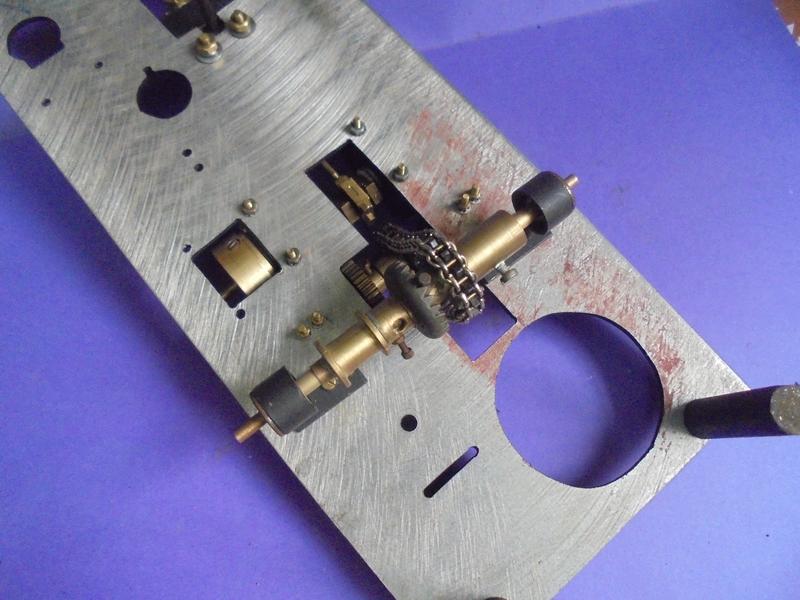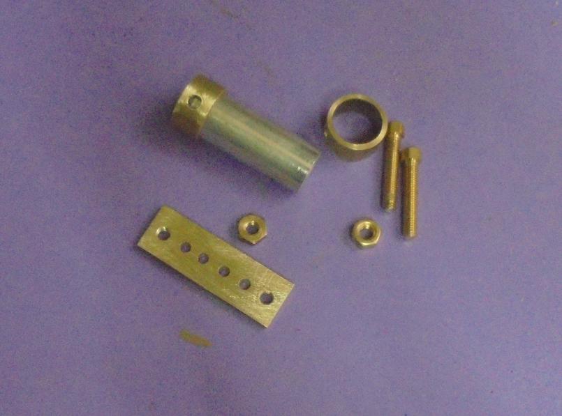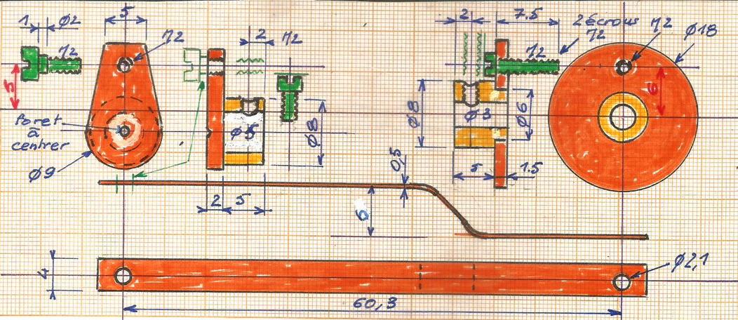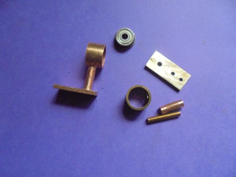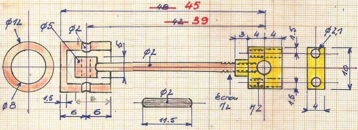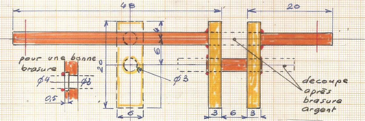 pour lequel on gardera de la longueur pour l'axe principal : coupe après un premier montage. Pour la brasure argent extérieure au maneton central, reprendre le perçage de 3 sur 1/2 mm pour favoriser le passage de la brasure argent.