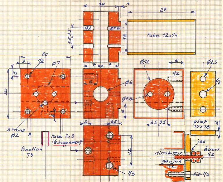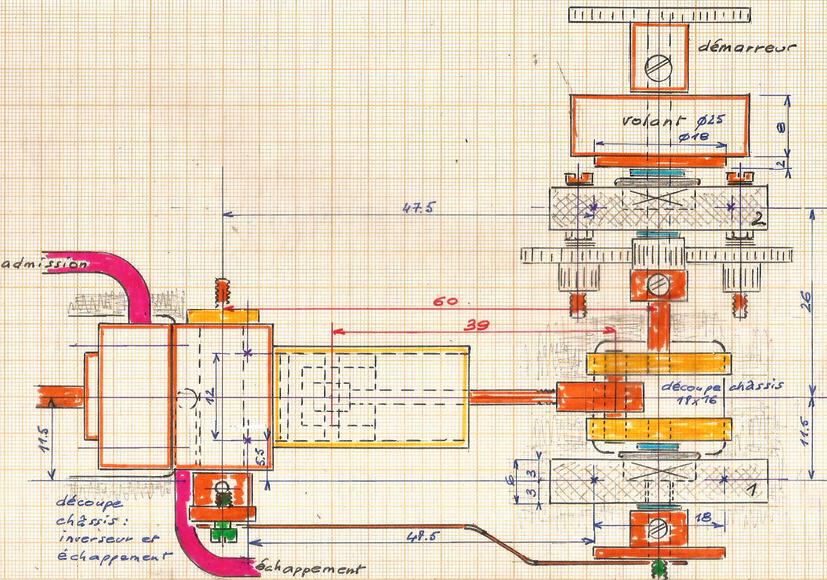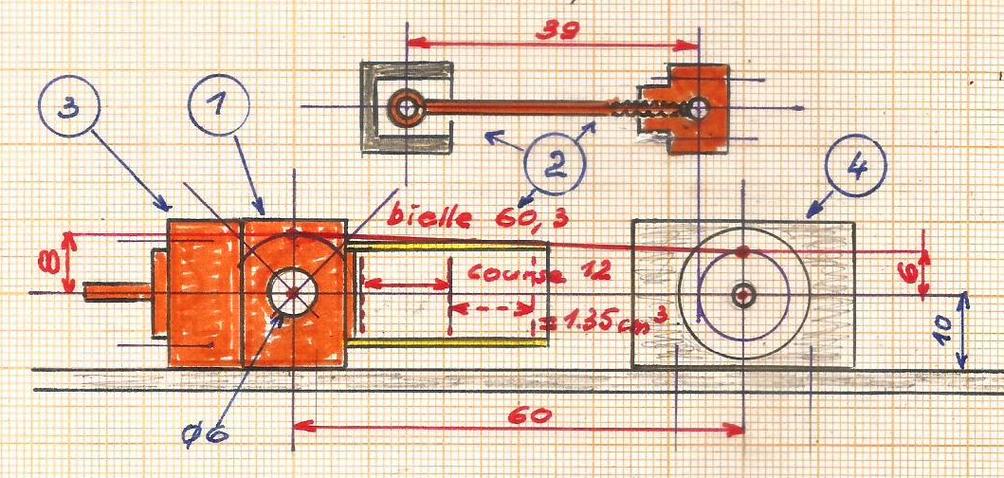 | Pour obtenir une cylindrée plus élevée, un cylindre de 10 x 12 et une course de 12 mm. La manivelle de la valve sera placée vers le haut pour éviter une découpe du châssis. |