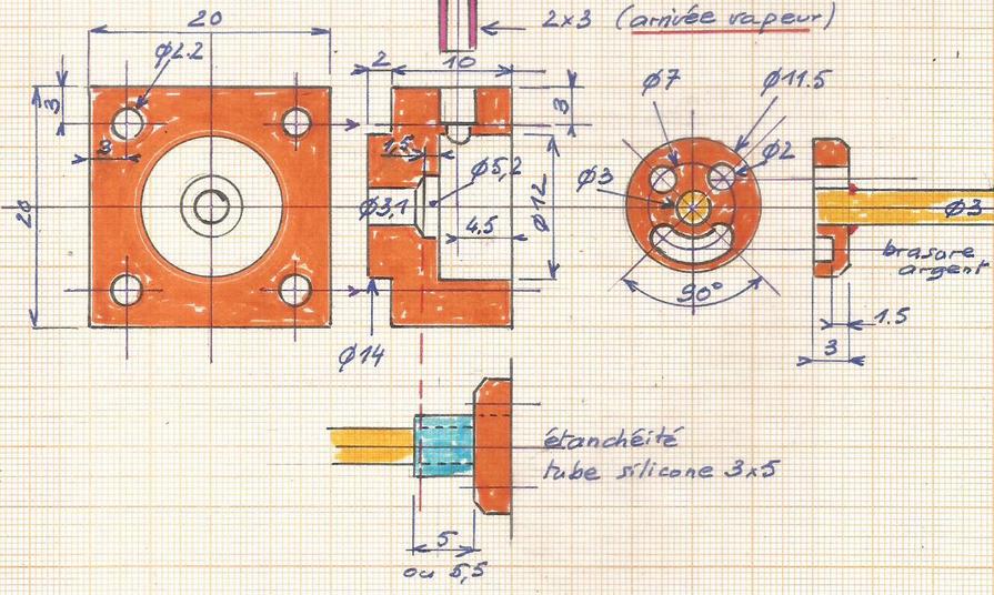 L'échappement se fera par le dessous. Ci-dessous, maintien de la valve. Les trous M2 prévus au-dessus ne sont plus utiles. |  |