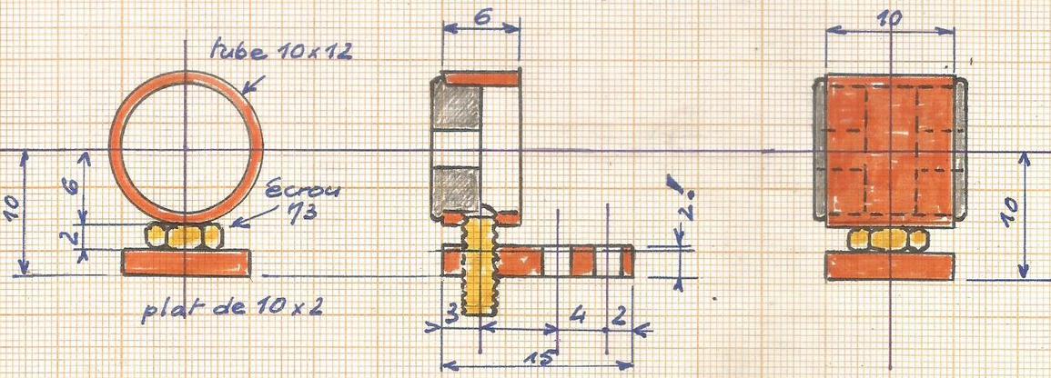 Ceux-là serviront au positionnement de l'arbre de transmission intermédiaire. L'un sera double pour supporter l'axe d'entraînement de la pompe. Pour obtenir un alignement parfait lors de la soudure (à l'étain cette fois), un petit montage expliqué par l'image. |