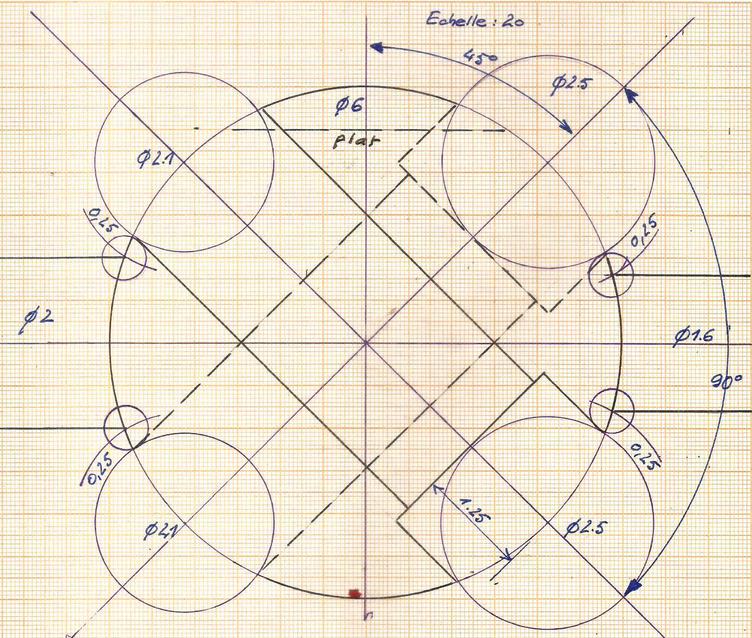 |  | Le plan et l'ordre de perçage : pointer, percer à 2.1 puis reprendre à 2.5 ; déplacer de 7, tourner le plateau diviseur, pointer ... Puis mettre à longueur et prévoir le taraudage pour le goujon M2. |