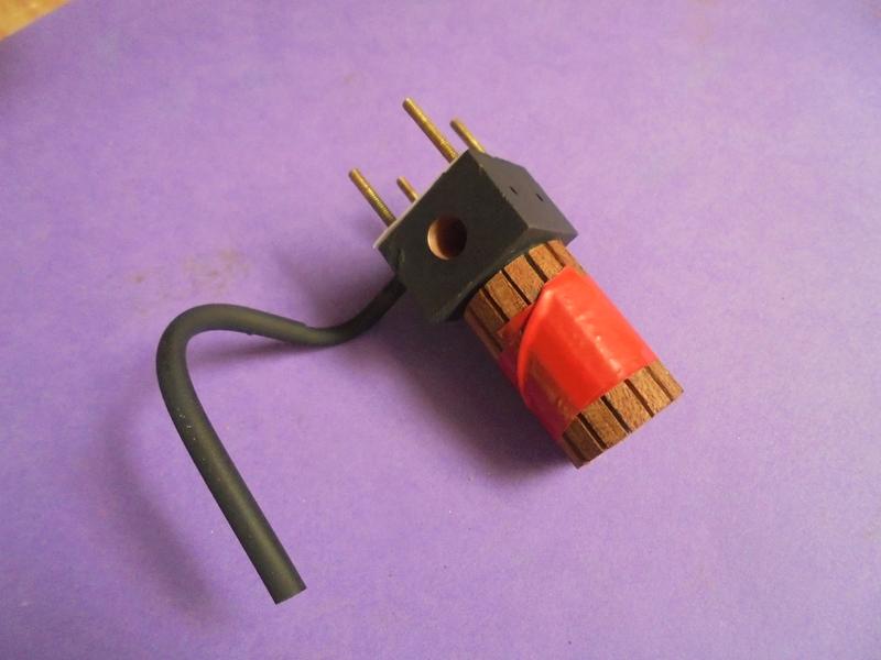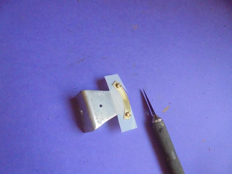 Pat de 0.5 x 6 percé à diamètre 4 ce qui nécessite un renfort en plat de 2 x 10 et que l'on prolonge par un doigt en rond de 2. Le petit tube en alu sert au positionnement pendant la soudure à l'étain. L'arrondi est plus long que nécessaire au cas où ... on devrait reculer le montage. Seuls les bord de la languette doivent venir toucher le "traînard". |