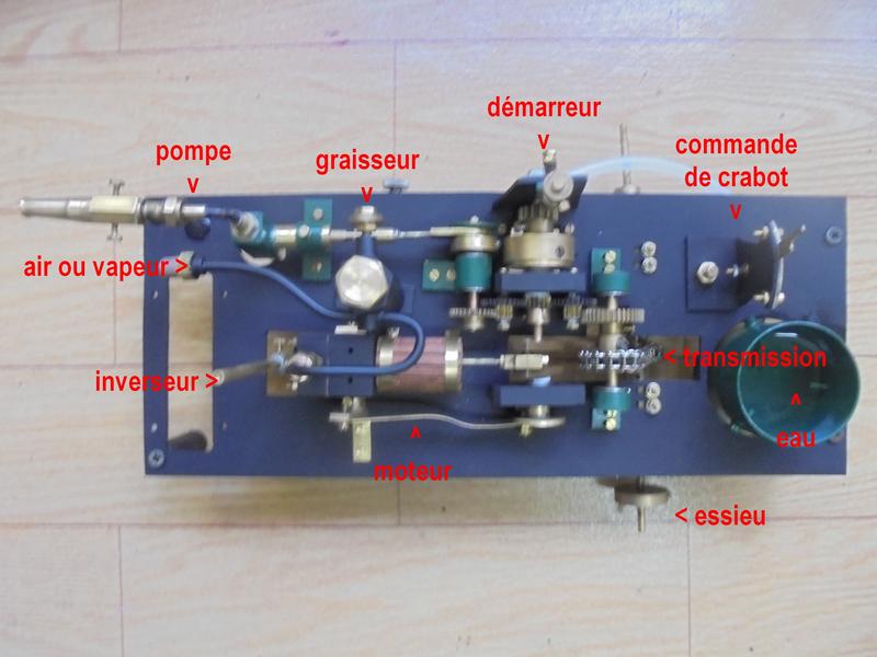 Bon amusement avec ce petit montage ... Mais on pourrait : . supprimer le démarreur manuel . installer un servo commandant le crabot . en mettre un autre en ne gardant que la marche avant, régulateur tout trouvé . la pompe peut ré-alimenter une chaudière . ajouter un inverseur . pour des roues à aubes, placer l'essieu au-dessus du châssis et prévoir une autre roue dentée . ... sans compter votre imagination ! |
