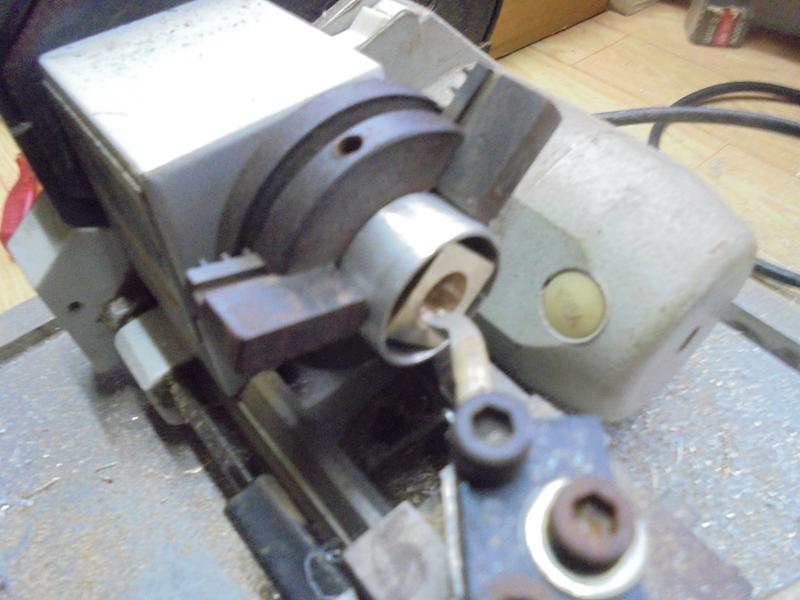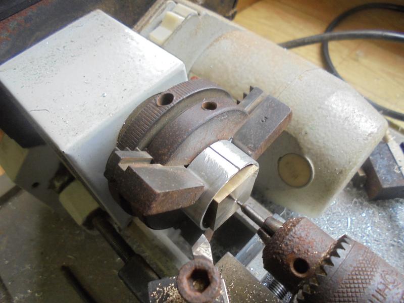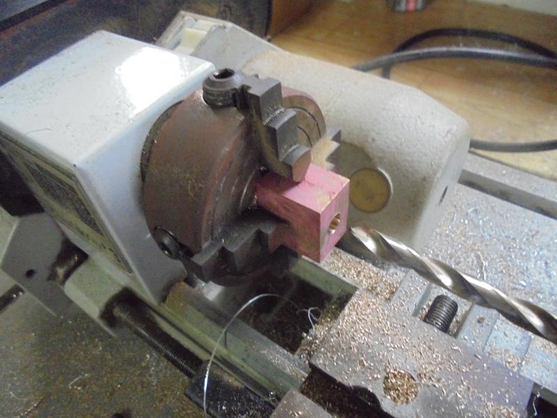 Alésage à diamètre 12 du corps de l'inverseur. Avec cette petite machine, on perce au maximum à 8 mais c'est suffisant pour utiliser l'outil d'alésage. |