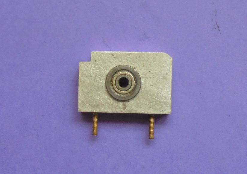 L'axe de la pompe se fera avec un palier à construction rapide (soudure étain) qui comportera 2 roulements. Pour la petite bague maintenant l'écartement, un tube de 3 x 4 qu'il vaut mieux reprendre un peu au tour pour être certain qu'elle ne touchera pas la roue dentée d'entraînement. |