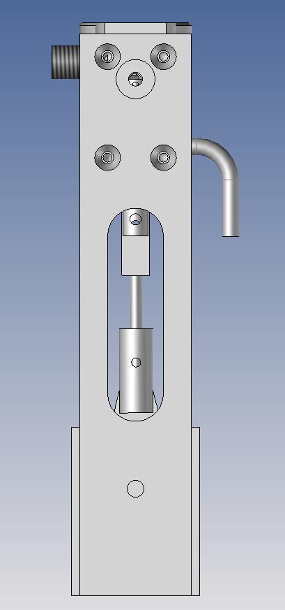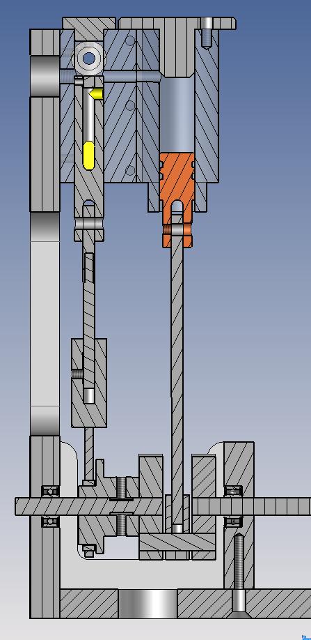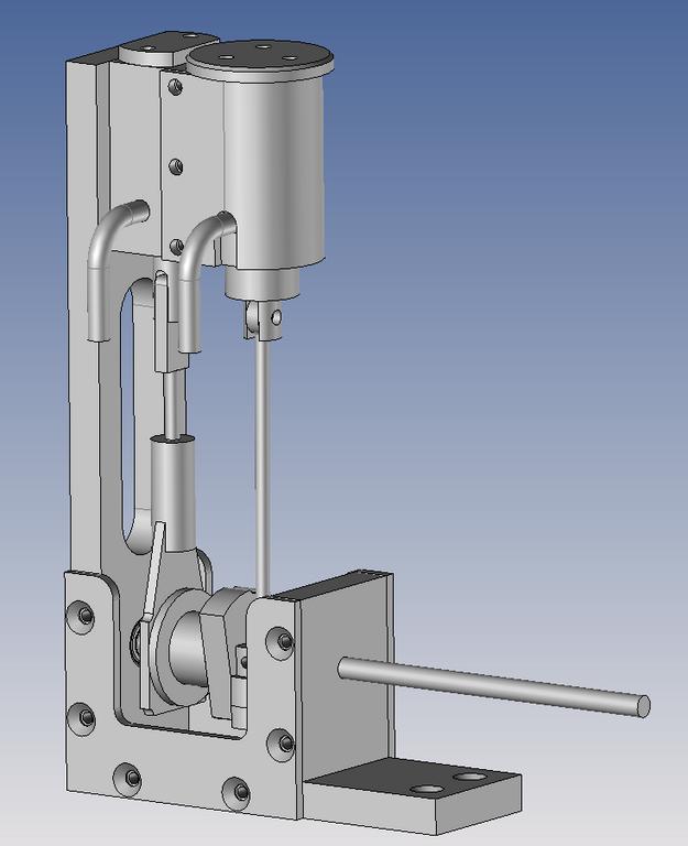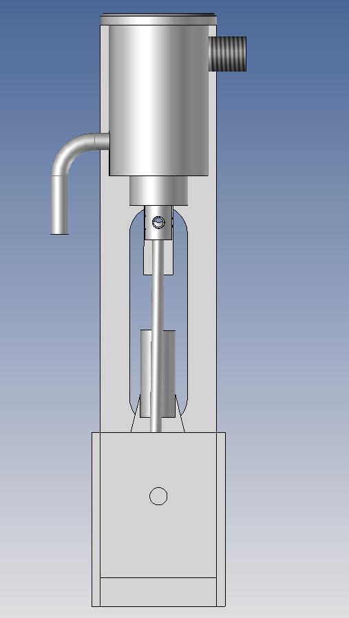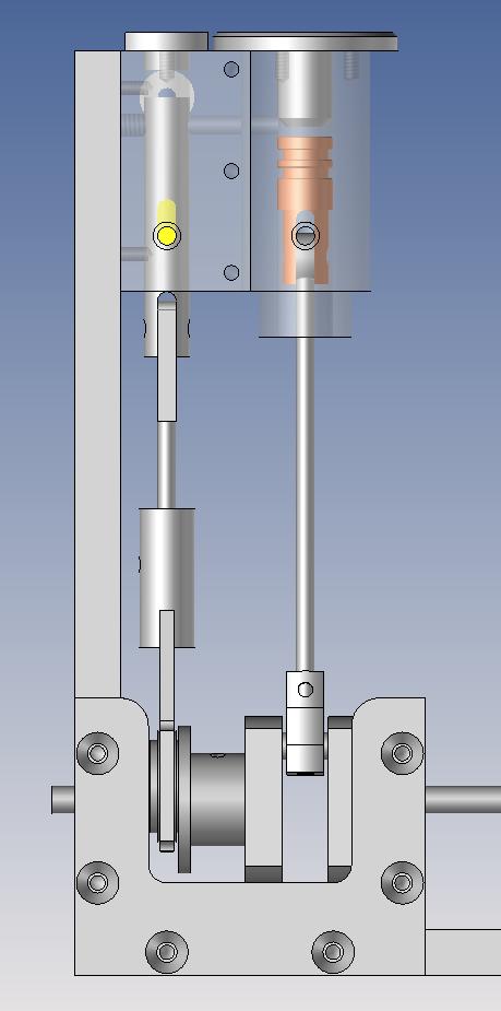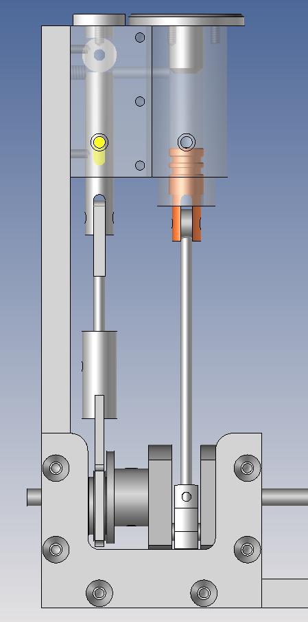 J'ai “redessiné” le piston qui est en acier (peut-être que ce n'est pas le mieux mais j'avais un axe issu d'une vielles imprimante réformée, idem pour le tiroir). Ceci pour avoir l'axe de piston mieux positionné, une longueur active du piston plus grande pour un meilleur guidage et une diminution de l'effet de bascule.