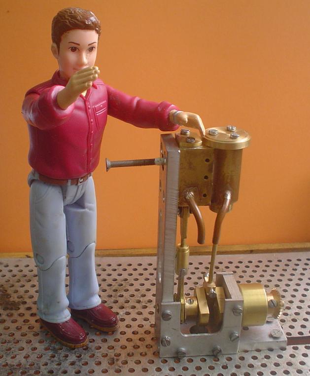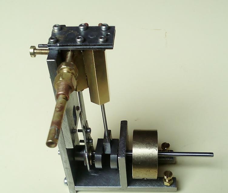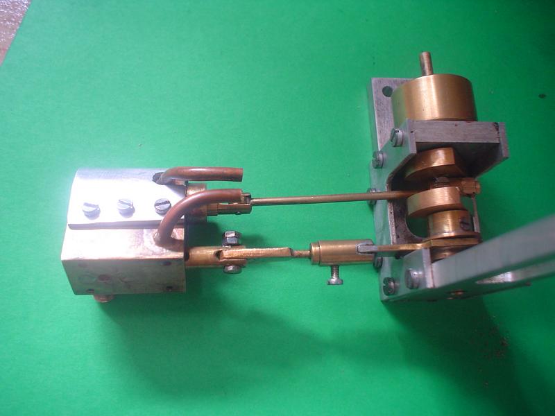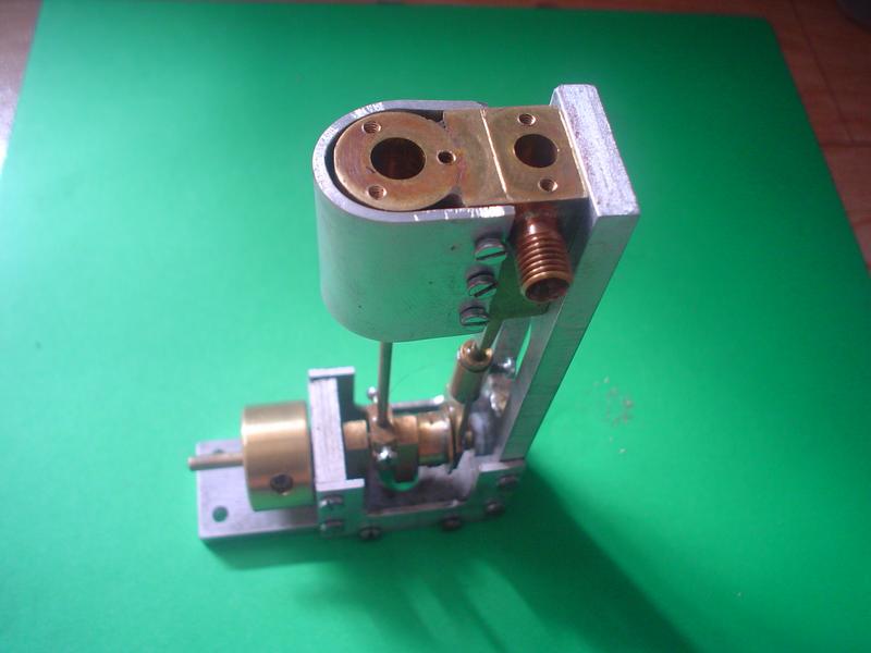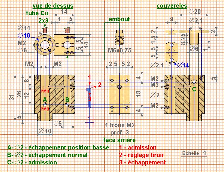 "Je viens de réactiver mon moteur; il re-fonctionne. Au préalable j'ai apporté des modifs, à savoir: J'ai “redessiné” le tiroir c.à.d: je l'ai allongé de l'ordre de 5 mm par le haut. Ainsi le jet de vapeur peut être dirigé directement vers le cylindre moteur en passant à travers le tiroir: un trou, face à l'admission vapeur, un perçage au centre du tiroir débouchant sur le trou qui conduira la vapeur dans le cylindre via le conduit, au moment opportun. J'ai accru de ce fait l'étanchéité et il n'y a plus de pression résiduelle qui pouvait pénétrer inopinément dans le cylindre piston et aussi pouvait s'opposer à la remontée du tiroir (je crois que ce phénomène se produisait). Le nouveau tiroir du fait de son rallongement venant interférer avec la plaque couvre-culasse, ça n'allait pas; donc j'ai percé la plaque au droit du tiroir qui la traverse. Le tiroir assure l'étanchéité de l'arrivée de vapeur par le recouvrement du trou d'admission . J'utilise pour la lubrification, à l'aide d'une mèche huilée en contact direct avec le haut du tiroir au PMH. (le système précédent a été désactivé). En outre, Je crois que le trou d'arrivée de vapeur dans le tiroir, aurait pu être au même niveau que le trou du conduit vers le cylindre piston; cela aurait simplifié le tiroir qui n'aurait eu besoin que de trous à 90° au même niveau. Je ne m'explique pas vraiment pourquoi le moteur ait pu fonctionner, tel que je l'avait fait, ni pourquoi il ne fonctionnait plus très bien Je constate que l'échappent PMB du piston empêche le moteur de se “libérer” et je ne comprends toujours pas. Je ne comprends toujours pas que le moteur prends ses tours, s'emballe même quand on bouche cet échappement ?. Et pourtant à haute vitesse, quelquefois, même sans boucher cet échappement, le moteur tourne furieusement, comprenne qui pourra.