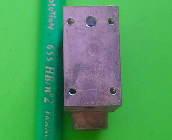 | Moteur vu de droite : trou d'arrivée vapeur de 2 repris pour la brasure de l'embout. 3 trous M2 pour la fixation du capot. |