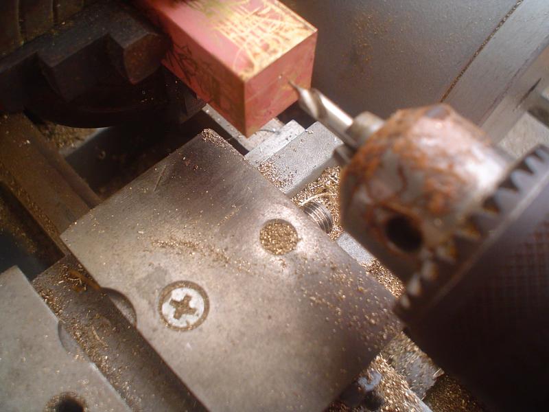 Coup de taraud M3 après le perçage du trou de 2 agrandi à 2.5 qui amène la vapeur au cylindre : ce filetage permettra de boucher le trou mais aussi le réglage de la position du tiroir quand le piston est au PMH |