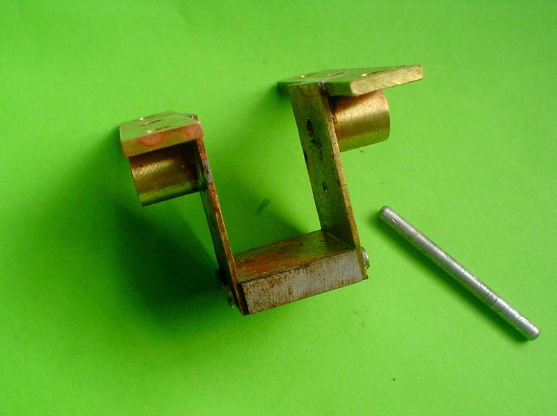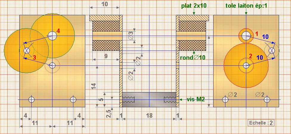 . récupération d'u grillage en alu (appareil radio) . une entretoise normale : tube cuivre ce 2 x3 sur 14 mm de longueur . une entretoise particulière, celle du sommet : rond de laiton de 6 percé à 2.1 don on reprend le diamètre sur un des côtés pour ne pas gêner l'engrenage; percer à 1.6 au mlieu, tarauder à M2, visser un goujon M2 et souder à l'étain |