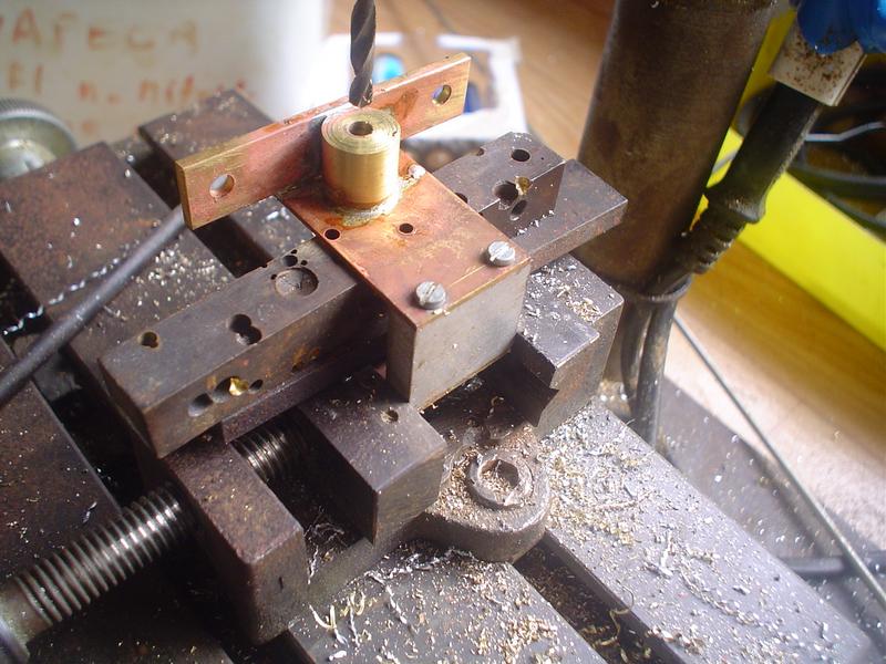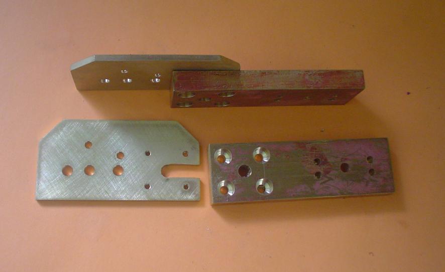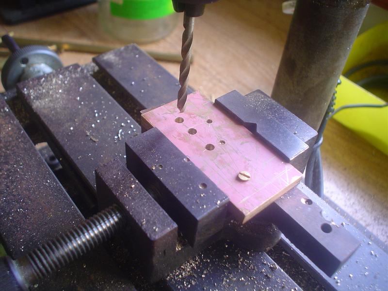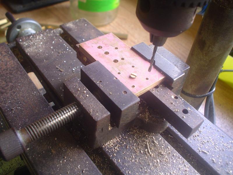 | | Après découpe, les côtés en tôle de laiton sont tracés puis usinés ensemble en maintenant les deux par vissage : le perçage de l'axe de transfert est le plus important. |