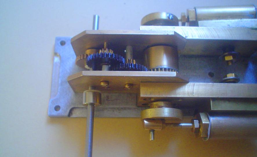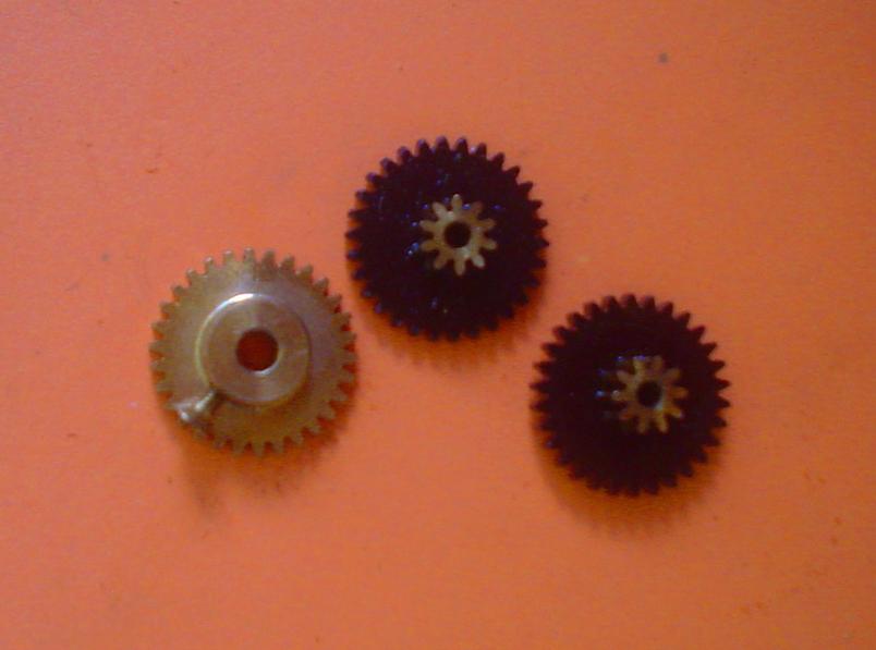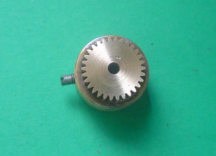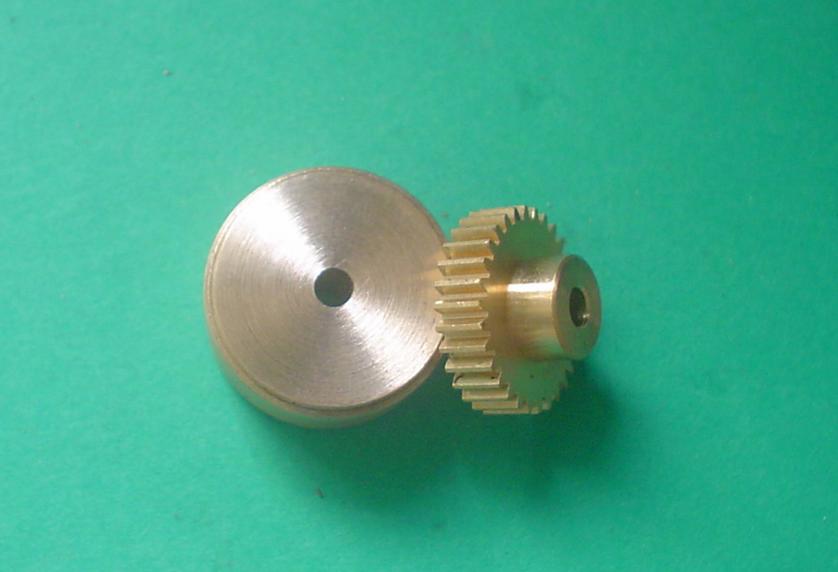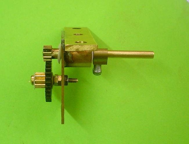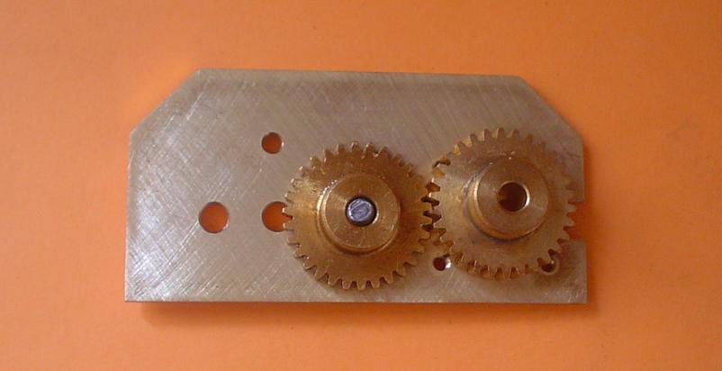 |  | Côté moteur. Le pignon de 10 dents a été soudé à l'étain sur une tige de laiton de 3 dont on a ramené une extrémité à 2 (diamètre intérieur de la roue dentée). La roue dentée 30/10 est maintenue par une vis M2 : ne pas bloquer et prévoir des rondelles de téflon. On peut aussi enfiler un axe car le trou existe de l'autre côté ...