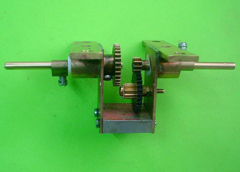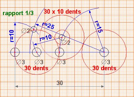 autre exemple | Réalisation d'un inverseur-réducteur qui va donner du nerf à un monocylindre oscillant avec un apport total de 12 : 1. De plus, il est muni d'un pignon supplémentaire qui va permettre par l'intermédiaire d'un levier d'obtenir le débrayage puis l'embrayage en marche avant ou en marche arrière. Construction dans cet : |  |