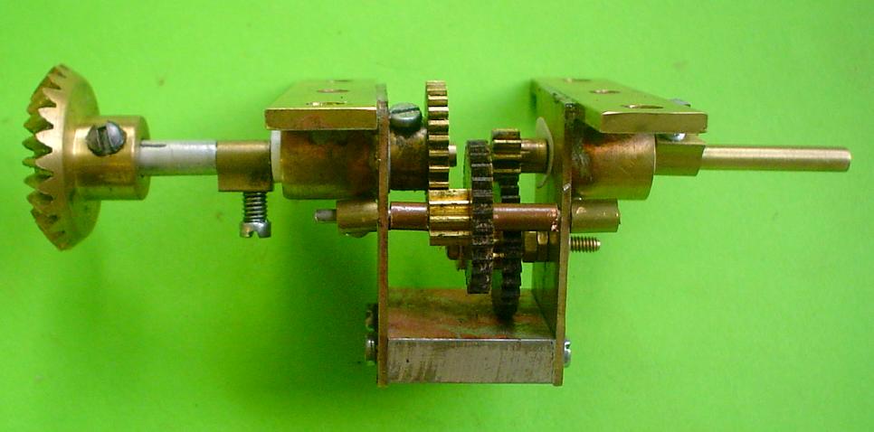 Certes, dans cette construction, la démultiplication est importante : 1/27ème mais il est possible de la réduire en modifiant le nombre de dents des roues dentées. Le même principe a été utilisé pour la construction de la boîte de transfert de la Mancelle mais avec un rapport de 1/10ème.