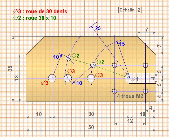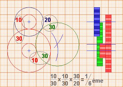 Roues dentées utilisées (références de l'OCTANT) : 1 - roue à denture droite W0/1 de 10 dents 2 - roue à denture droite W30/101 de 30 et 10 dents 3 - roue à denture droite W30/101 de 30 et 10 dents 4 - roue à denture droite W0/6 de 30 dents
