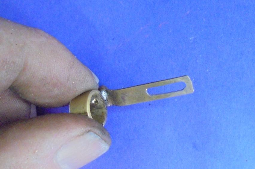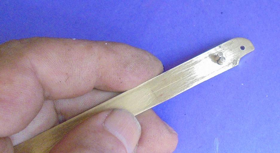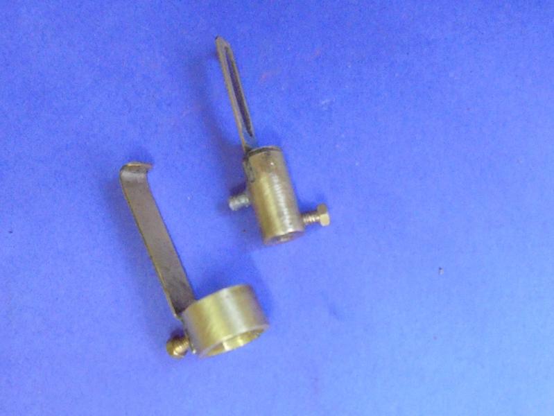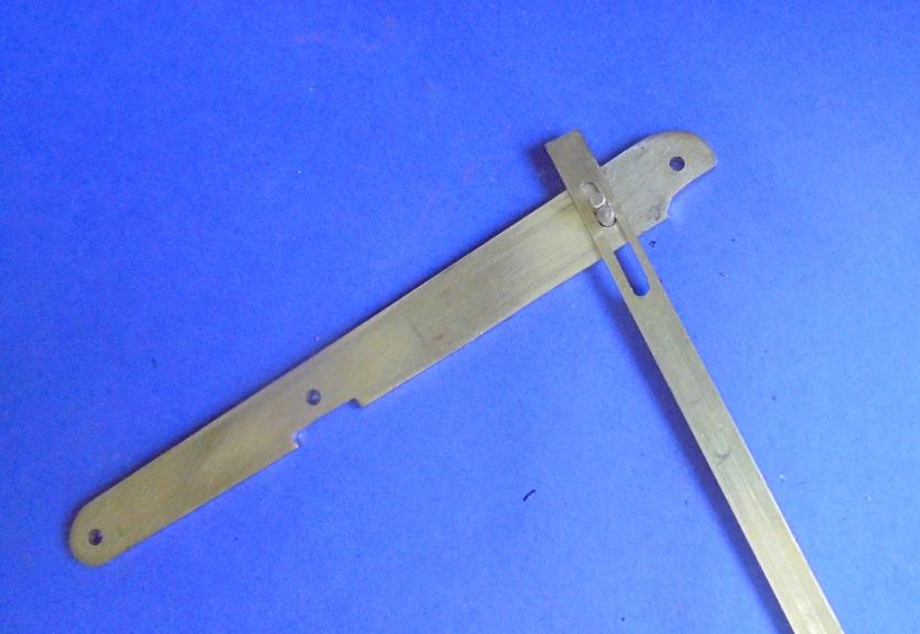 | La glissière complète et le limitateur à gauche. Pour ce dernier il s'agit d'une première version ou la limitation de course était obtenue par pliage de la lame de laiton : par performant ! |