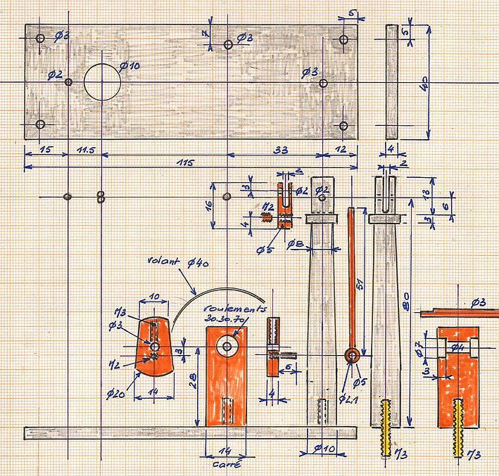 | Le socle, le pivot, le support de l'axe et le volant. Ces derniers proviennent du DADA.