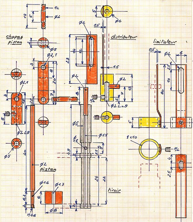 Toutes les pièces. Les cotes du tiroir sont données au croquis suivant. Avant de souder les tubulures il est possible de procéder à un essai de fonctionnement après avoir vérifié la bonne réalisation du tiroir dont on va voir les têtes à travers les trous du corps. |