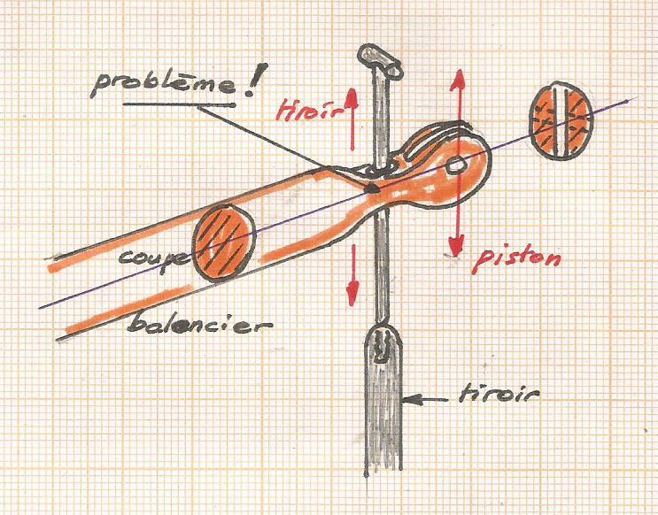Le tiroir est prolongé par une tige qui va en déterminer le déplacement en venant buter sur le balancier : . déplacement vers le haut grâce à un taquet fixé sur la tige . déplacement vers le bas par l'extrémité du tiroir de forme sphérique