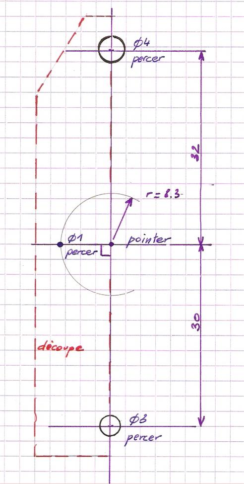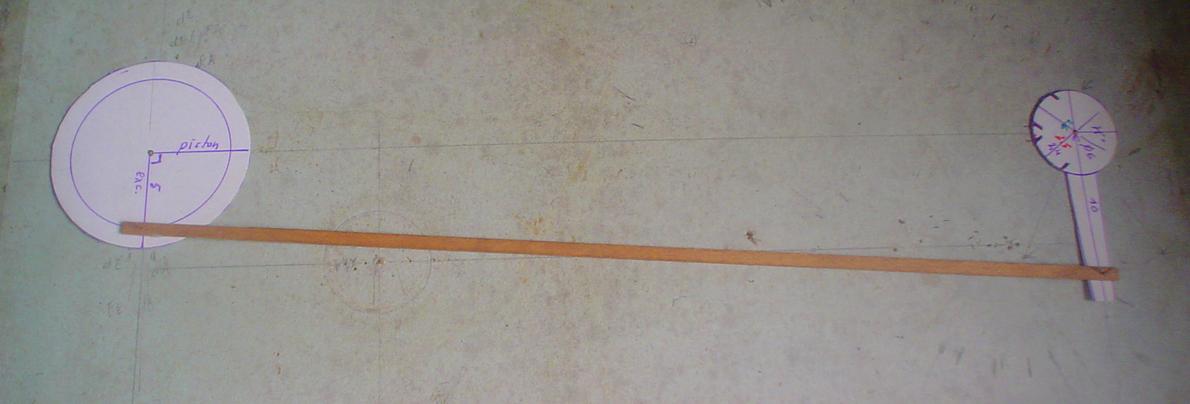 Pour le repérage du point fixe dont le traçage n'est pas aisé , on peut se fabriquer un gabarit qui prendra appui sur les axes du moteur (excentrique) et du distributeur. Attention, celui-ci concerne le prototype : entraxe de 30 et 32. |