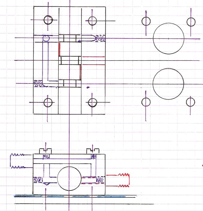 Les angles ont été exagérés pour mieux visualiser. Constatation, l'axe du trou d'admission est plus proche du trou menant à la tête de cylindre, celui de l'échappement s'en éloigne et, pour une réalisation correcte, il est bon d'en tenir compte et donc de calculer cet angle.