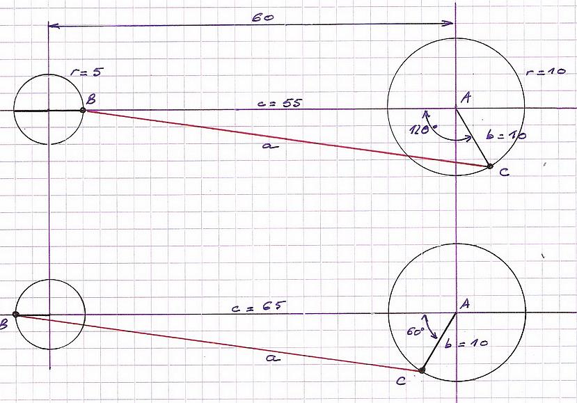 Calcul de la longueur de bielle (le maneton de l'excentrique est en B) : . premier croquis : Cos A = Cos 120 = - Cos (180 - 120) = - Cos 60 = - 0.5 = (b² + c² - a²) / 2 bc et a = 60.62