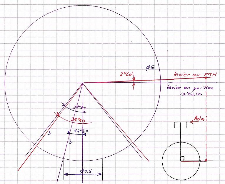 Sur ce croquis, à gauche, la position du maneton au moment du PMH ( à 90° de l'axe du piston) et, à droite, en rouge, la position de la bielle. La position du levier n'est donc pas parallèle à celle du maneton : position dont il va falloir tenir compte car le levier détermine par construction l'emplacement des axes des trous.