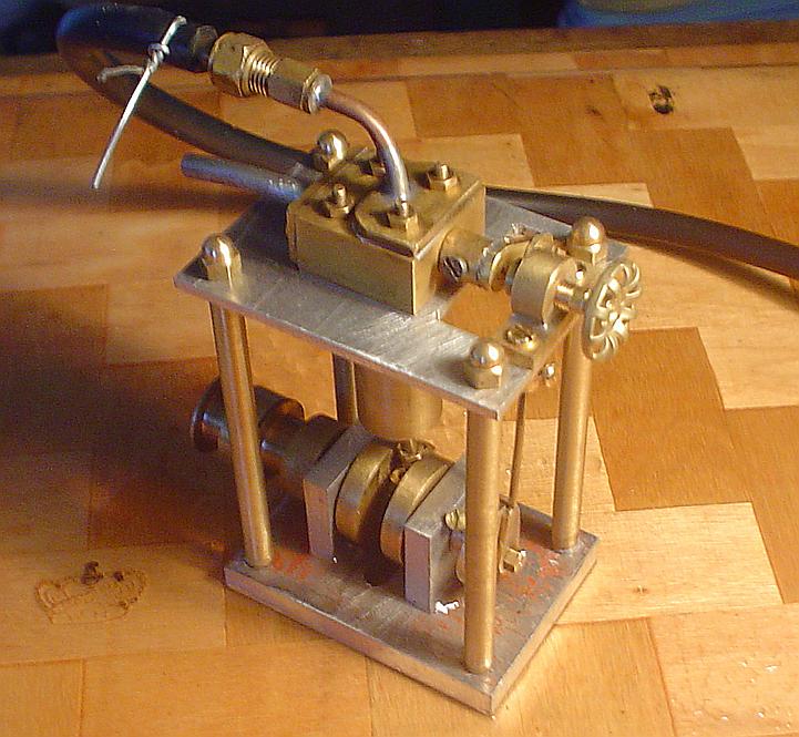Ainsi conçu et aussi imparfait qu'il soit, il va démarrer facilement et tourner d'abord à l'air. Mon compresseur ayant rendu l'âme (mes voisins sont contents !), en attendant le suivant je me suis rabattu sur un compresseur pour peinture dont la pression est anémique ce qui ne l'empêche pas de l'entraîner : bonne nouvelle !