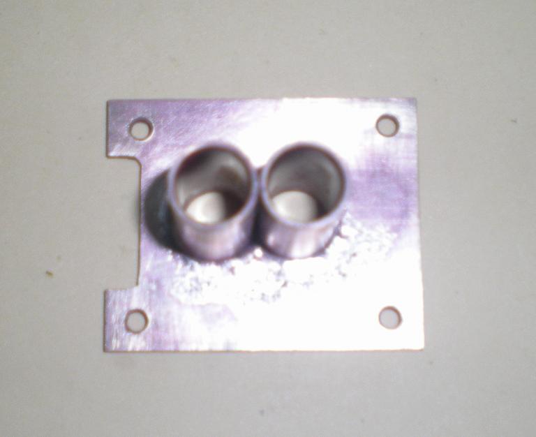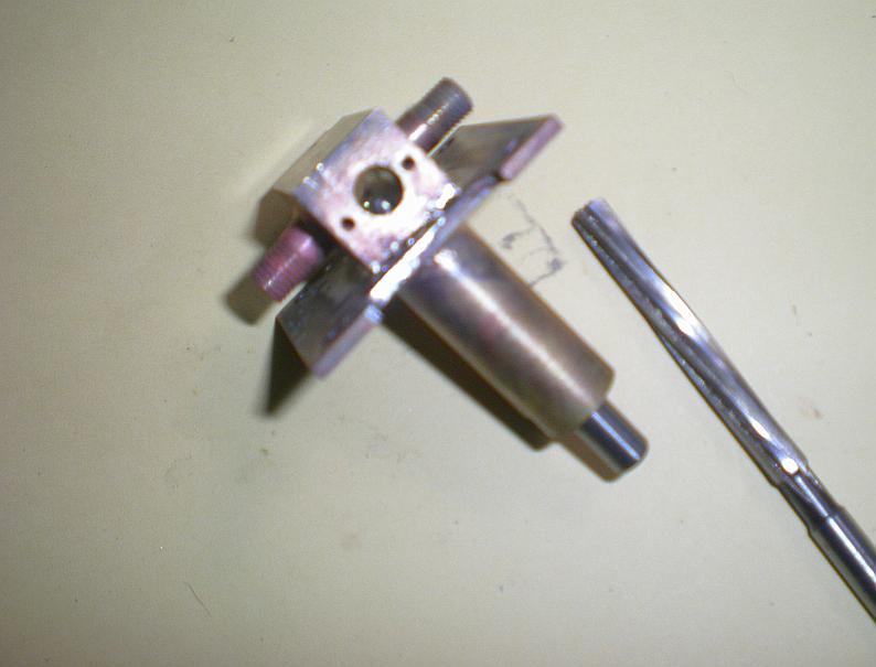 | Opération terminée : repasser l'alésoir de 6 dans le corps, passer une fraise à tige longue (on aperçoit son extrémité qui sort du cylindre) de diamètre 2 dans les trous où l'étain a probablement débordé, repasser le rond d'alu dans les cylindres en s'assurant qu'il va bien jusqu'au bout.
