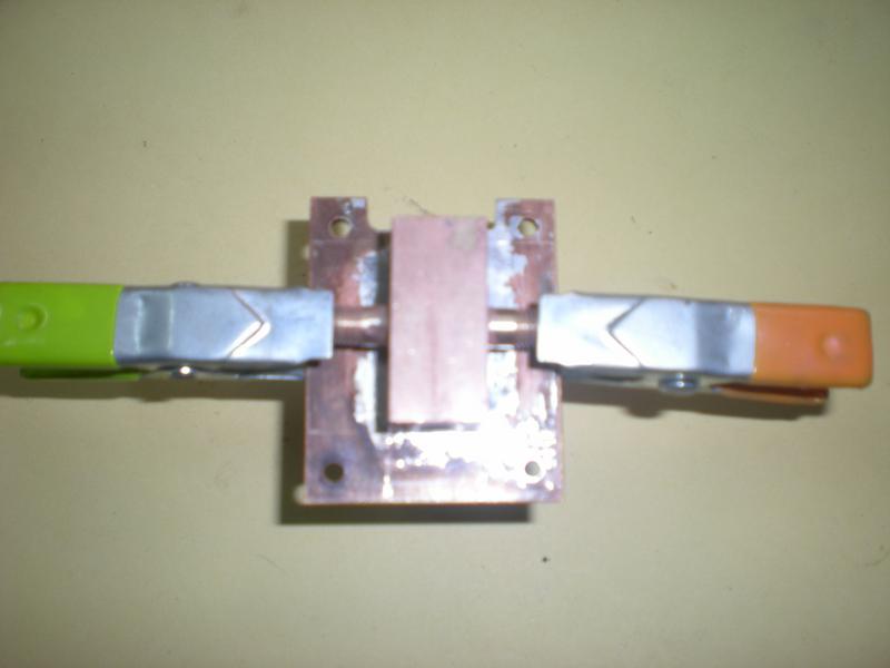 Soudure des deux éléments. serrage, chauffage puis petit cordon d'étain sur le pourtour. Laisser refroidir longuement avec les pinces. |