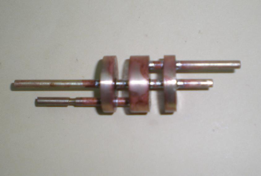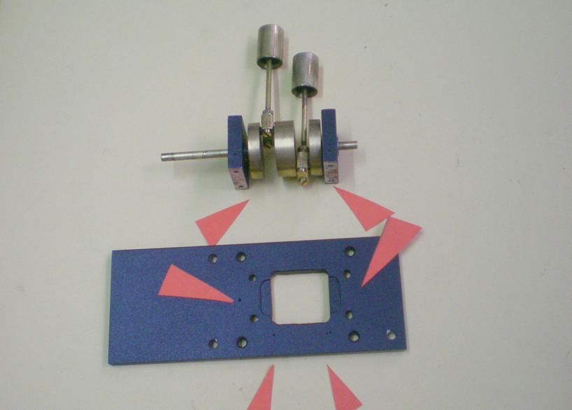 | Dans l'ordre, les paliers portant le vilebrequin et les pistons, puis les jambettes et le support du "point fixe". Volant et disque d'excentrique. |