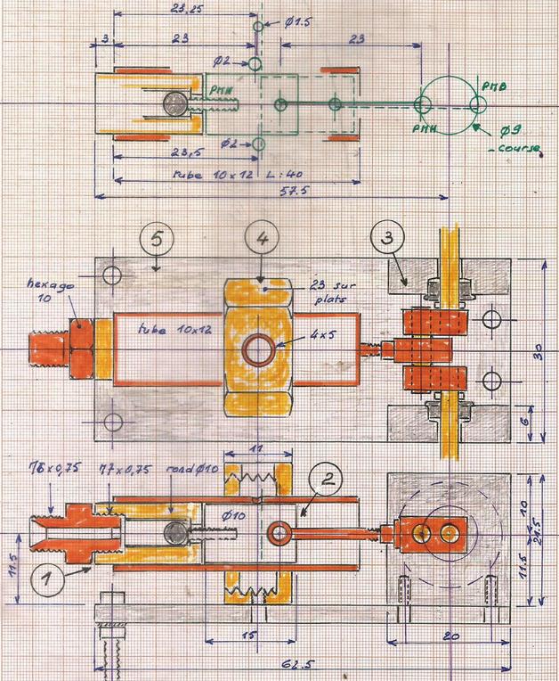 Petit problème : plus de taraud adéquat ! Donc perçage à 3 pour qu'il aille plus loin et remplacement de la vis M2 par celle qui est dessinée. Petit avantage, on pourra si nécessaire reprendre le diamètre de 3 pour ne pas bloquer l'axe du vilebrequin. |