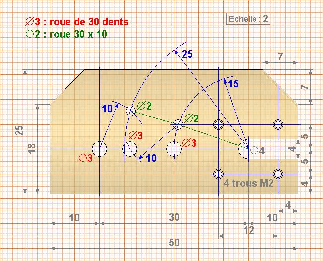 Les deux côtés du réducteur et ceux du bâti. Pour obtenir le meilleur placement du réducteur, il vaut mieux reprendre les trous sur le bâti à la fraise : avec un fond bien plat et des trous plus grands (M2 sur le réducteur), on a une petite marge pour le réglage de la position de la première roue dentée.