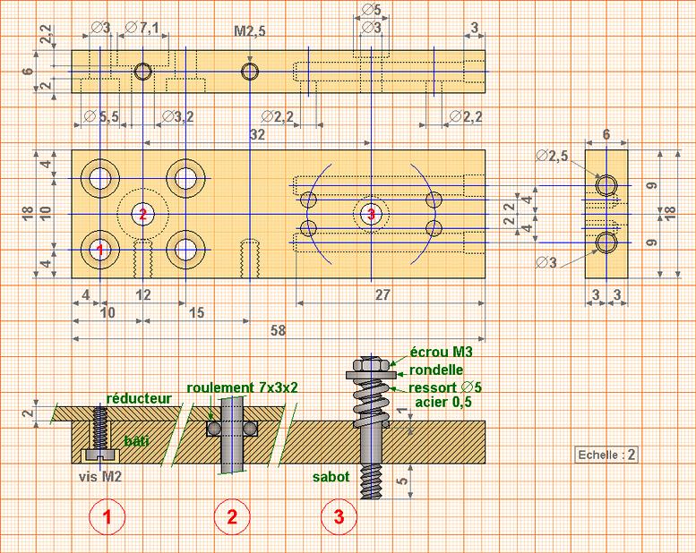 2 - Les roulements seront bloqués par les côtés du réducteur. On agrandira le trou du passage de l'axe à 3.2.