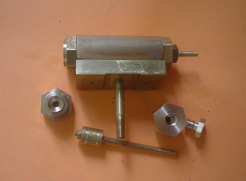 Un cylindre terminé et les pièces constitutives du suivant : bouchons, piston avec sa tige et le presse-étoupe. |