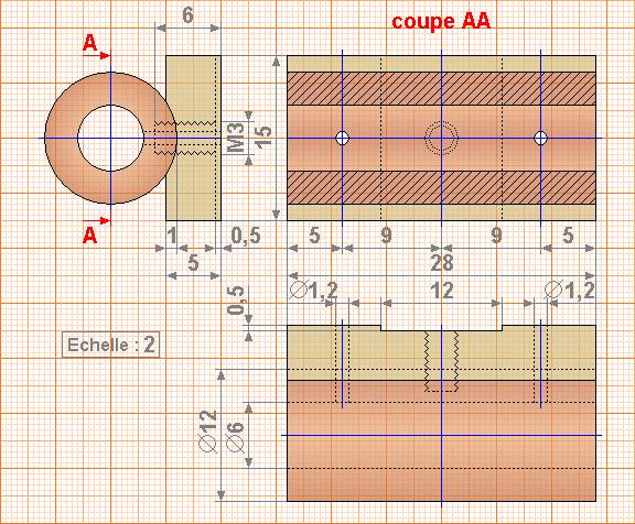 Le pivotement du sabot peut être gêné par la forte épaisseur (5 mm) si le perçage n'est pas tout à fait d'équerre : on peut repercer à 3.1 pour ne garder qu'une épaisseur de 2 mm. |