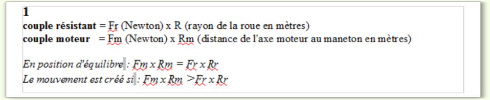- intensité de la force crée par le moteur : P (watts) = F (N) x Vitesse en m/s et F = P x V