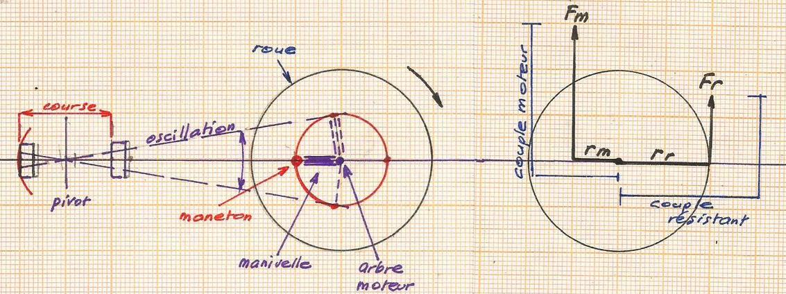 En fait il me semble que la longueur du levier doit être égale au rayon de la roue, voire légèrement supérieure. Ce qui a une incidence sur la course du piston. |