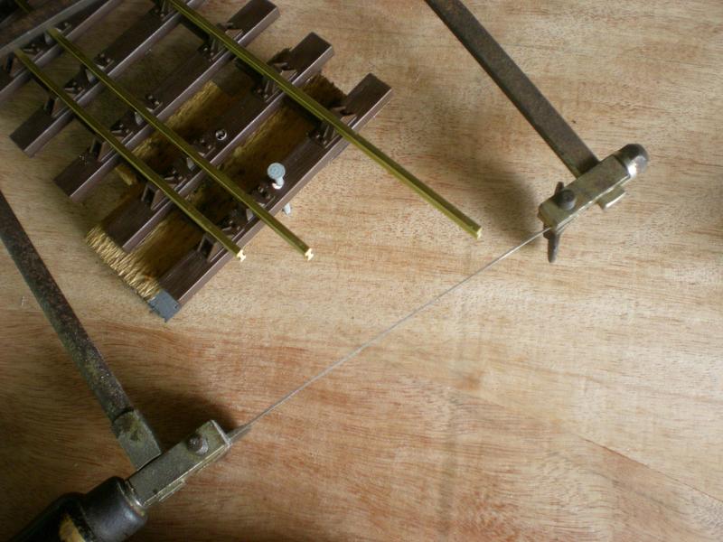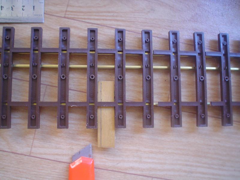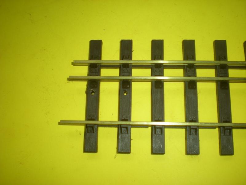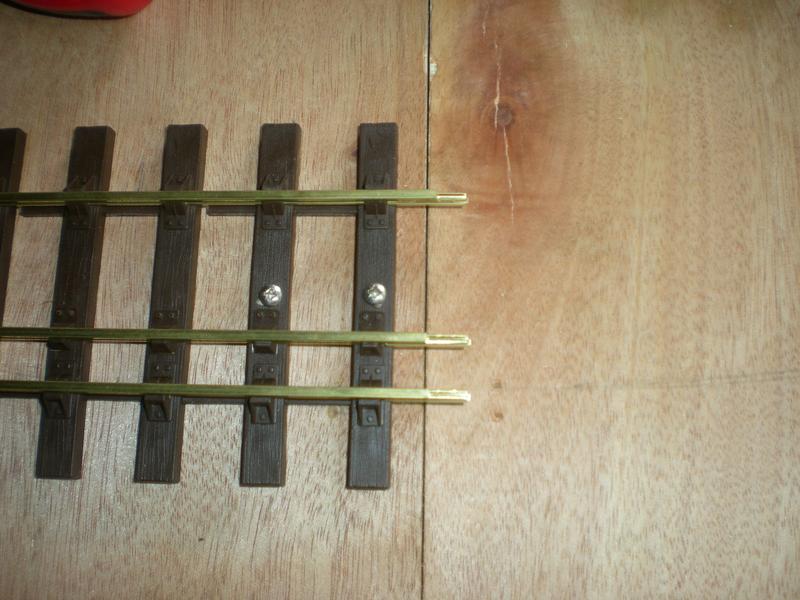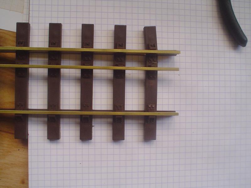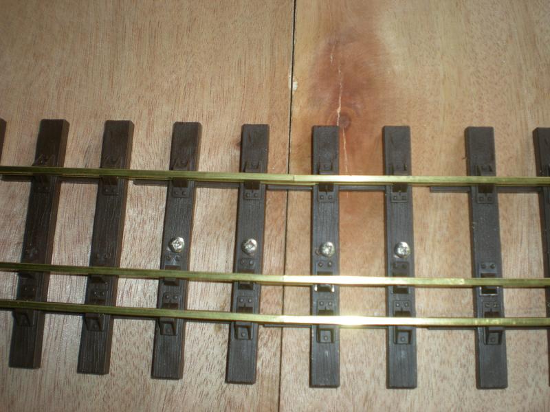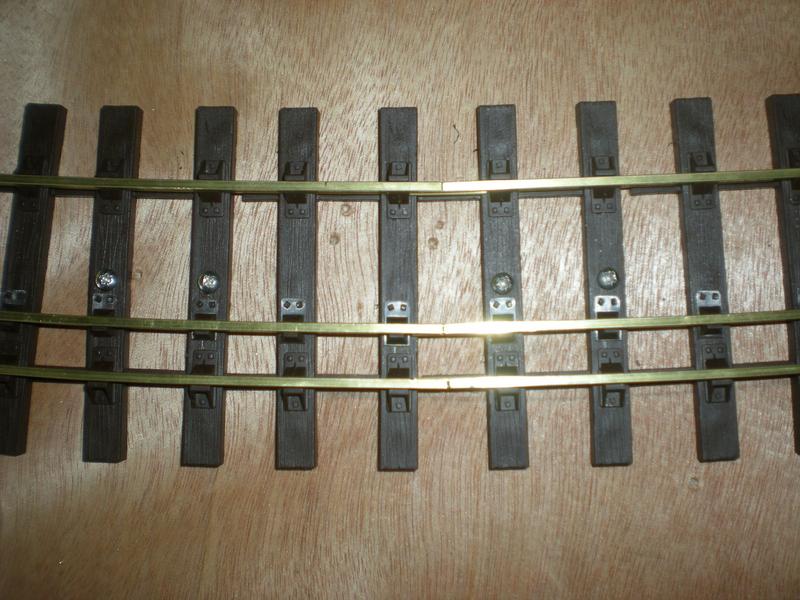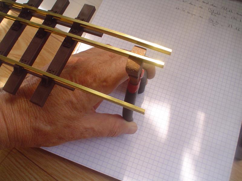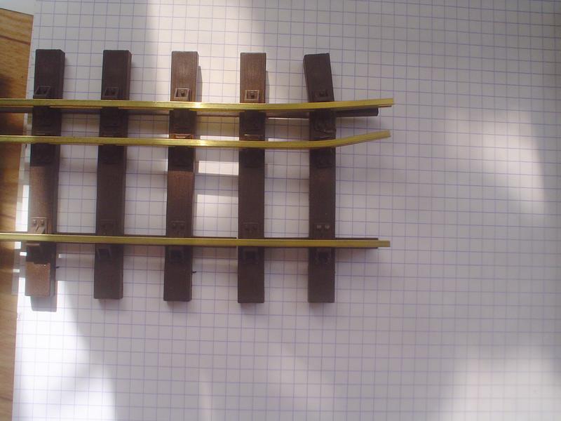 Les rails sont assemblés par éclisses en laiton (fishplates) et, il m'a semblé qu'une courbure à ce niveau ne serait pas judicieuse, l'éclisse ne prenant probablement pas la forme souhaitée. La liaison de deux rails se fera donc sur un tout petit tronçon de ligne droite. |