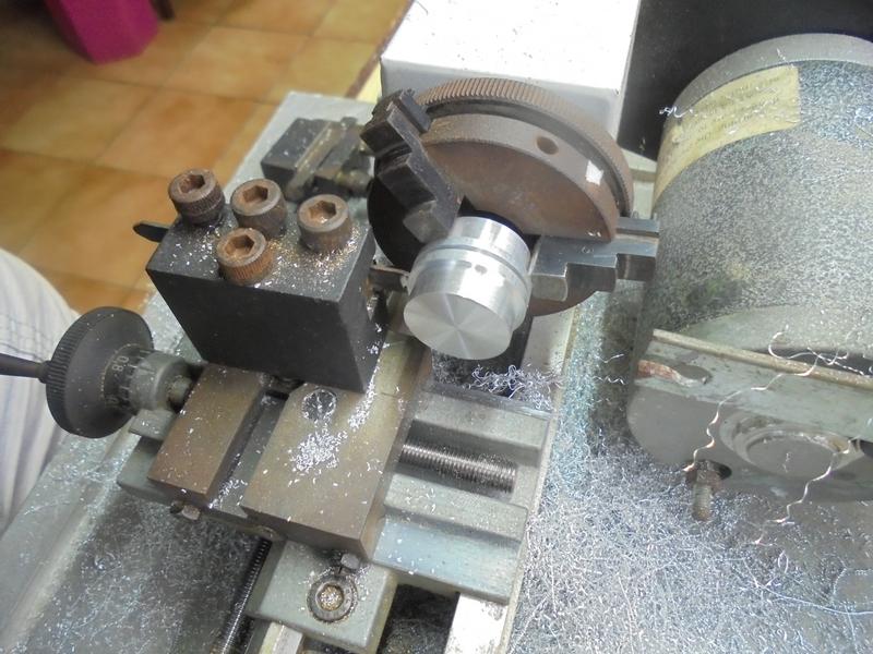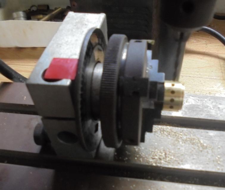 |  | Première photo de la construction. Les moyeux sont tirés d'un rond de laiton de diamètre 16 et, au diviseur on percera 12 trous de 2 d'une profondeur de 4,5.