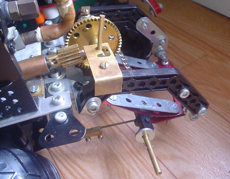 | | Ici on utilise à la place de l'ergot, un engrenage Meccano de 25 dents dont le contact est parfait avec la roue de chant de 25 dents également.